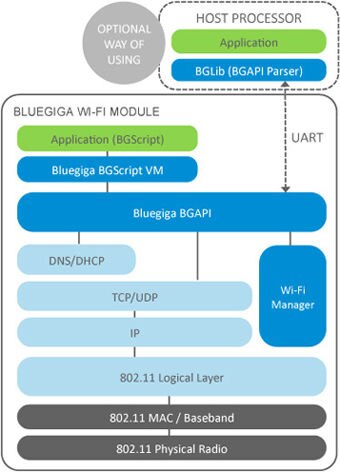Bluegiga Legacy Wi-Fi software provides powerful, low overhead, and easy-to-use Bluegiga BGAPI? serial protocol that can be used over UART, USB, or SPI interfaces. BGAPI serial protocol provides access to functions, such as Access Point discovery, association and encryption and connection establishment as well TCP and UDP data trasfer. To simplify the software development for external host processors the Bluegiga Wi-Fi software also includes a Bluegiga BGLIBTM C-library that implements the BGAPITM serial protocol parser and it can be easily ported to various embedded systems.